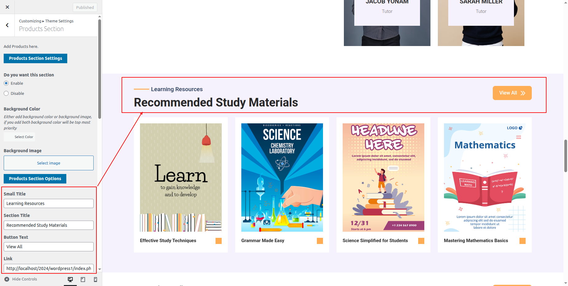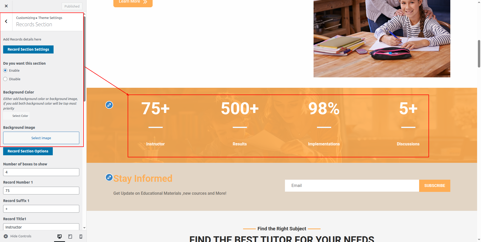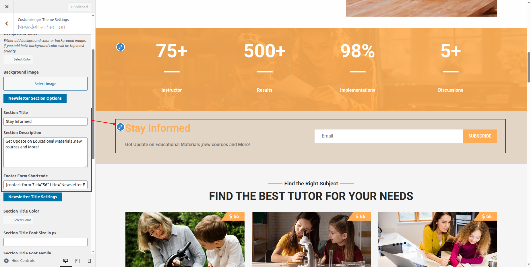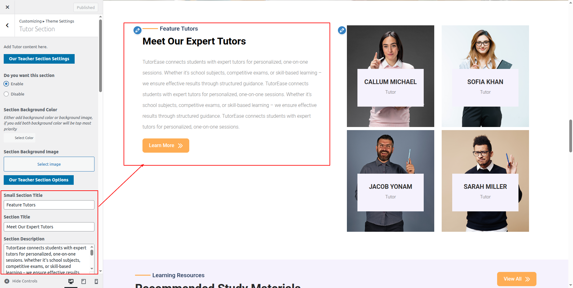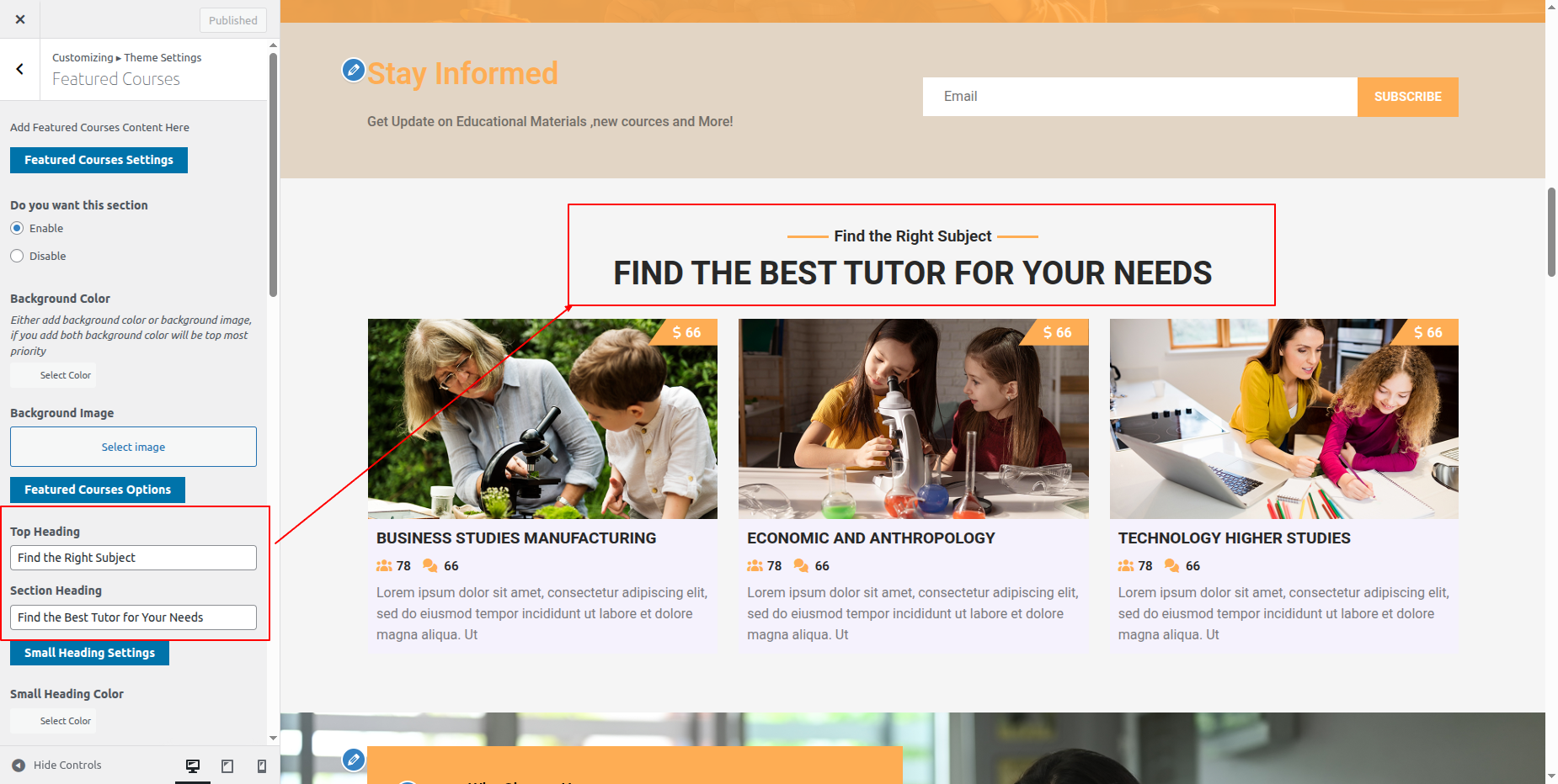 Go to Appearance >> Customize >> Theme Settings >> Tutor Section.