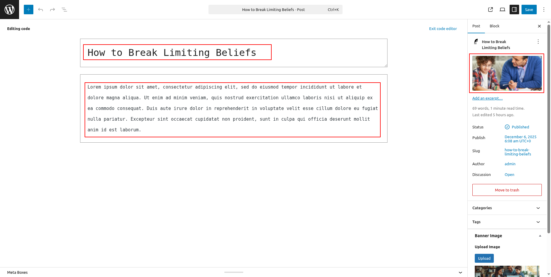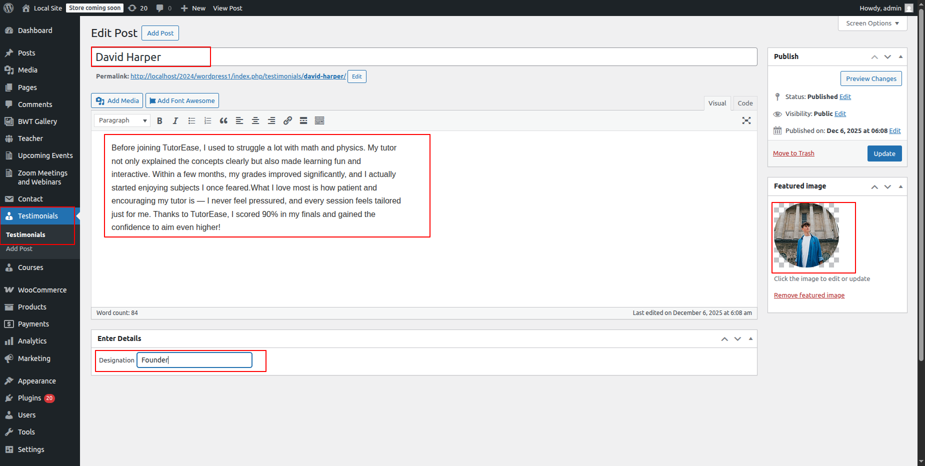 Enter the post name, contents, and featured image in the Testimonials area when adding a new post. then select "publish".