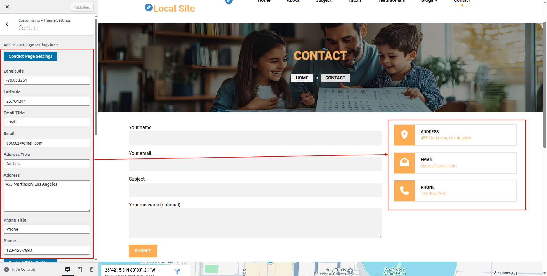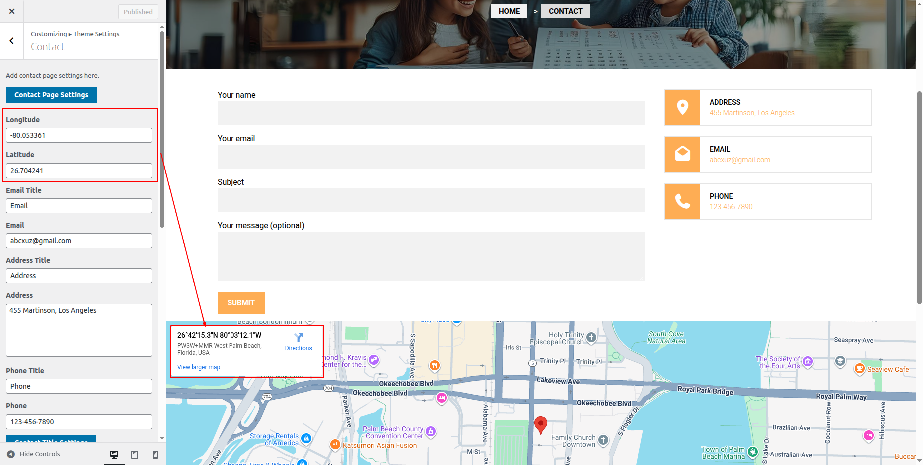Go to Appearance >> Customize >> Theme Settings >>Contact Section