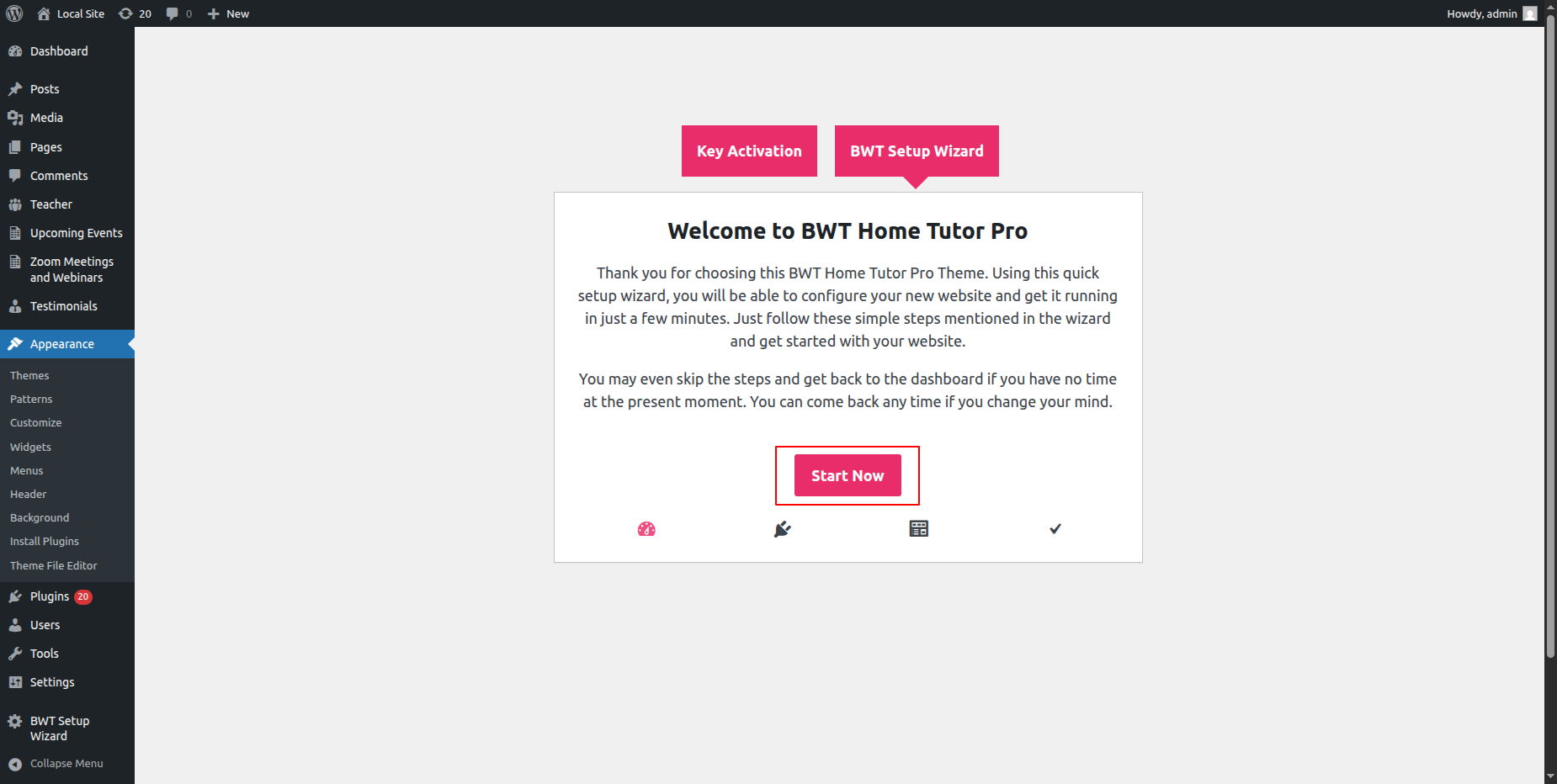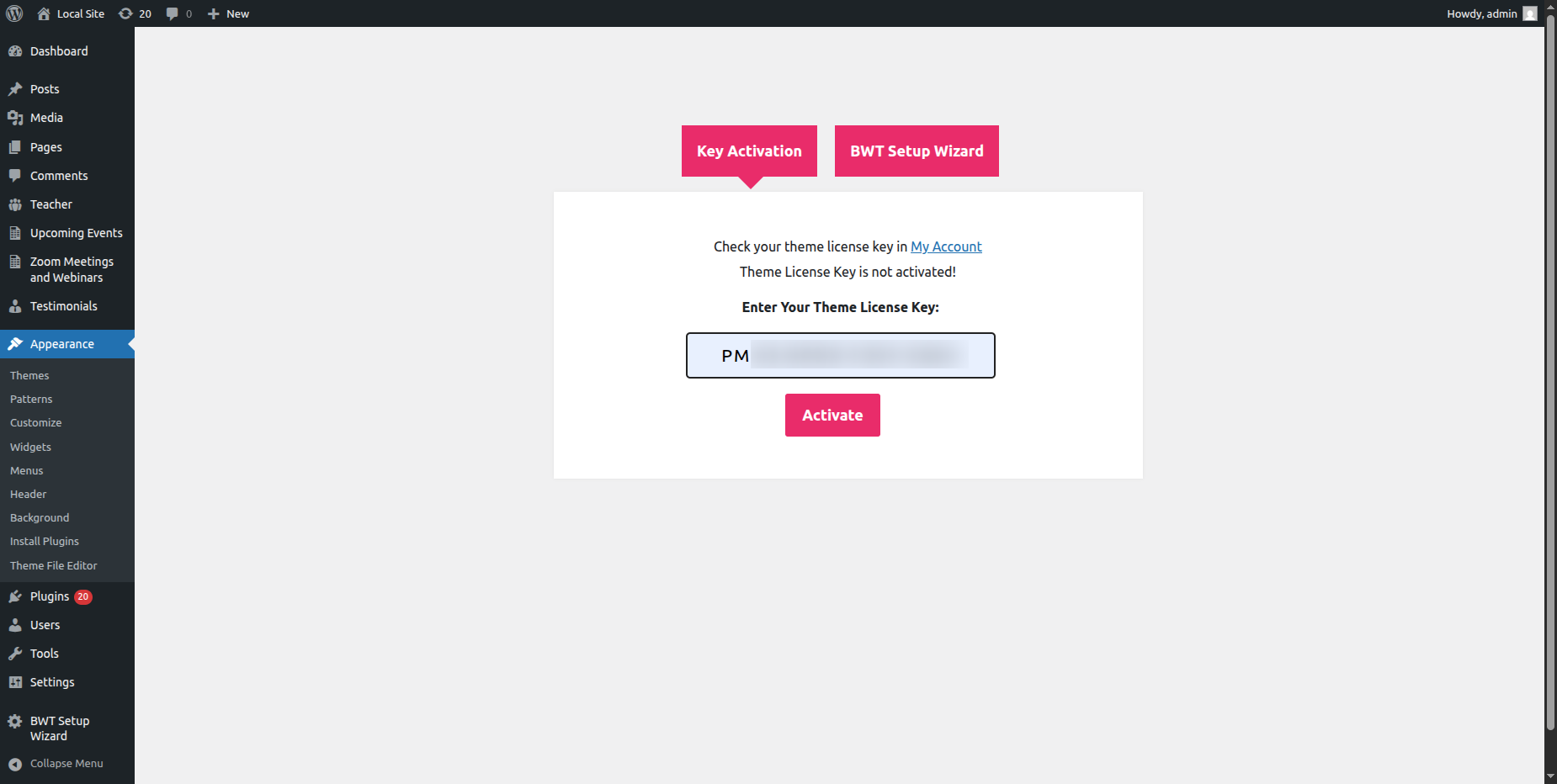 Go to Dashboard >> Appearance >>BWT Key Activation>>Enter Key>>Save Changes.