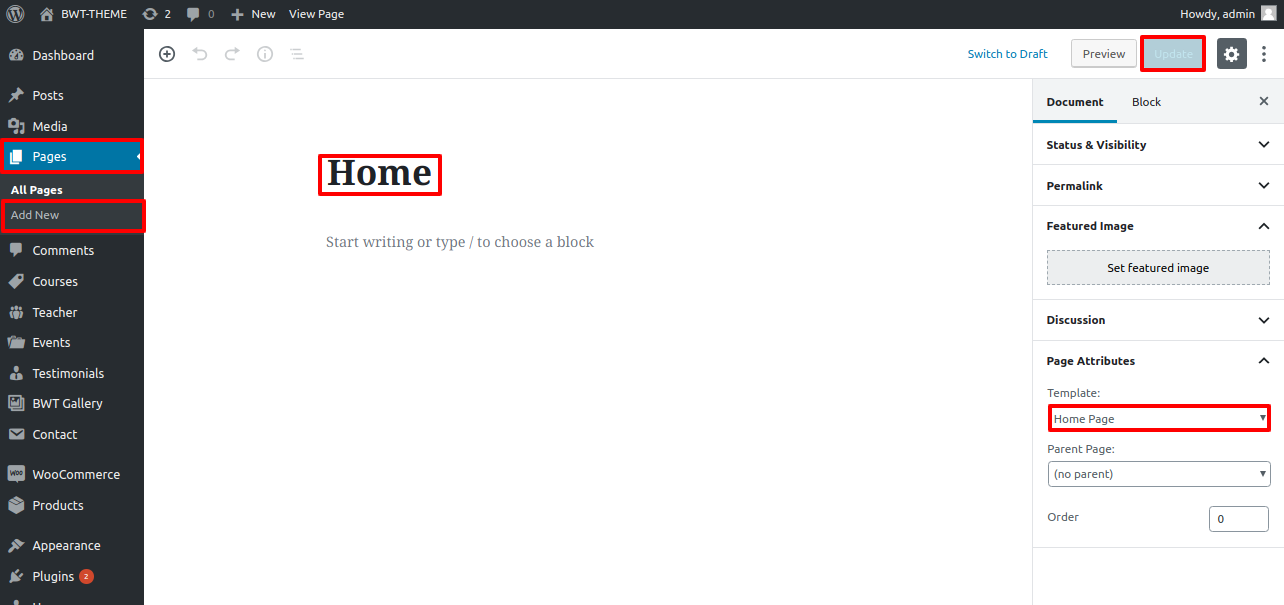 To set a template for a new page, navigate to the Dashboard, click on Pages, and then select Add New Page. Give the page a name, such as "Home," or any other desired label. Next, choose the "home-page" template from the dropdown menu of available templates.