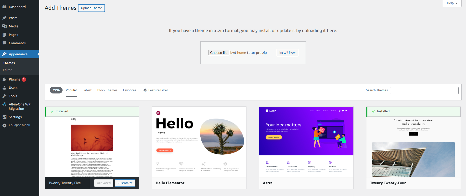 4. Choose your home-tutor-pro.zip theme by clicking on the Browse button, and then click the Install Now option.