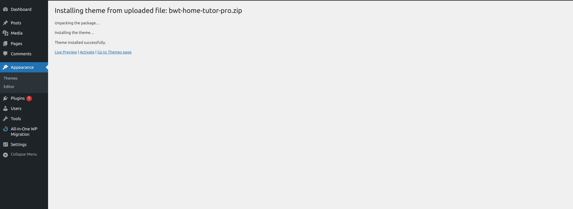 5. WordPress will now complete the installation of your theme and display a success message and a link to activate or view a live preview.
