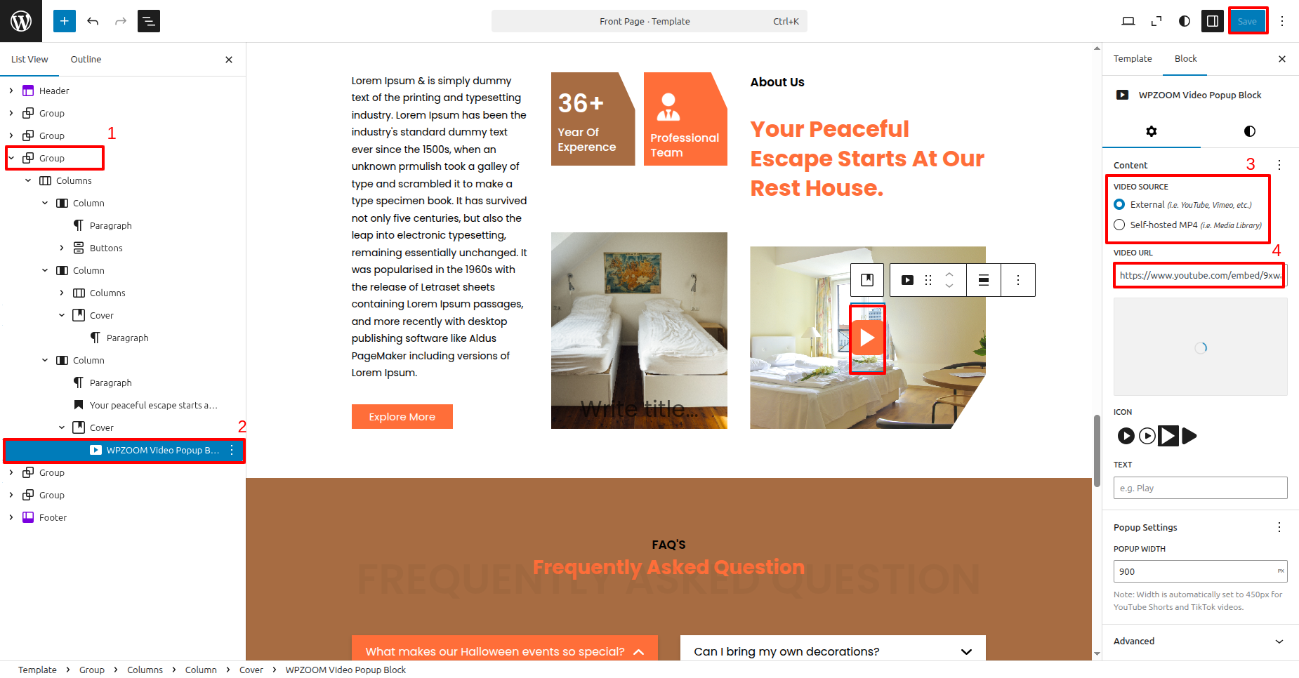 To add video, you need to install the Video Popup Block by WPZOOM plugin.