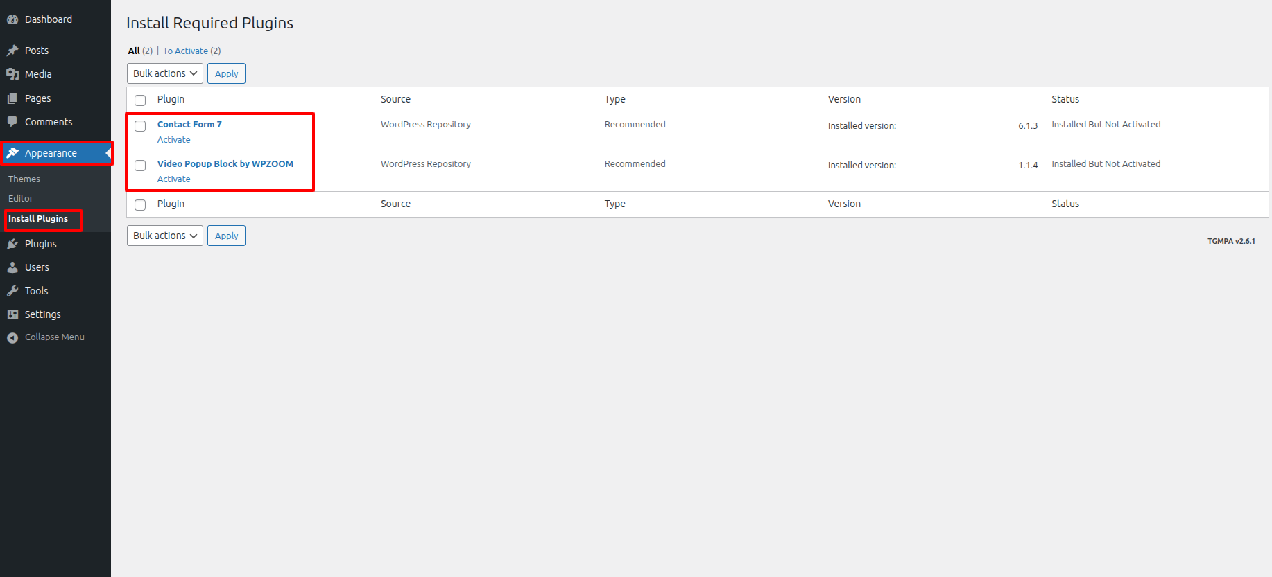 Visit Dashboard >> Appearance >> Install Plugins >> click on >> Install Plugins