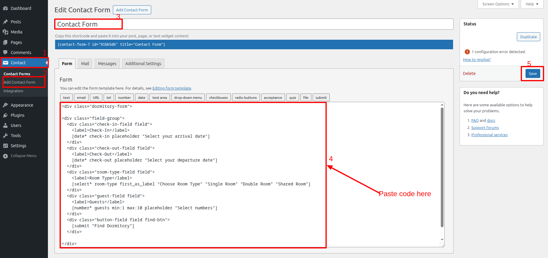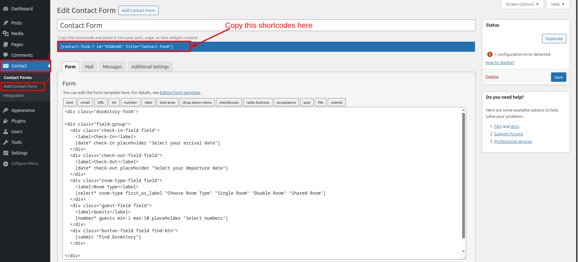 Visit Dashboard >> Contact >> Add Contact Form >> click on >> Save >> copy this shortcodes Plugins