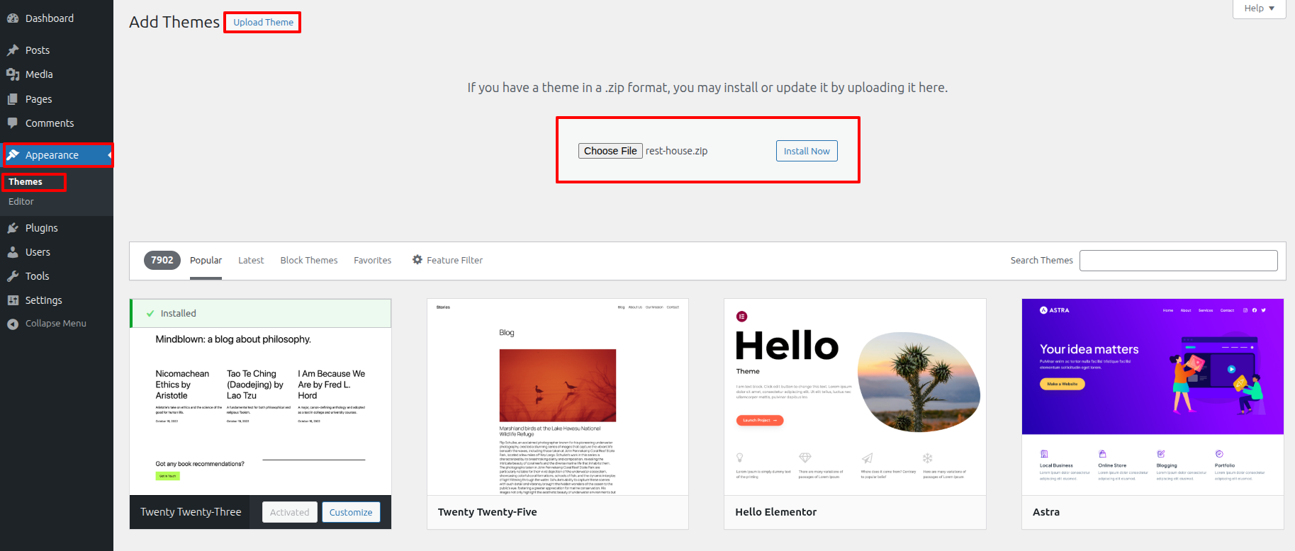 2. Toggle the Browse link then select your rest-house.Zip the theme, then select "Install Now."